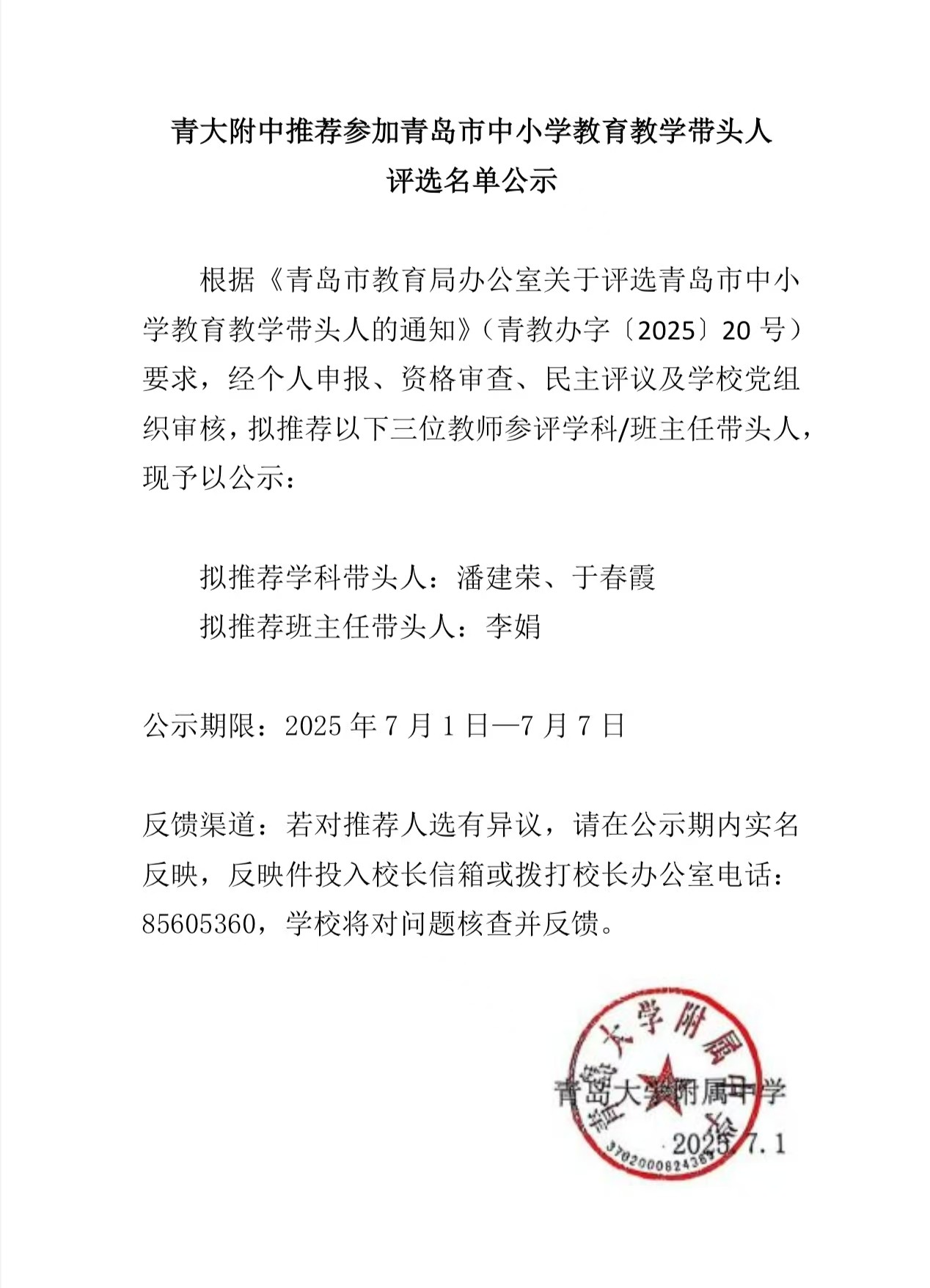青大附中推荐参加青岛市中小学教育教学带头人评选名单公示